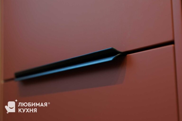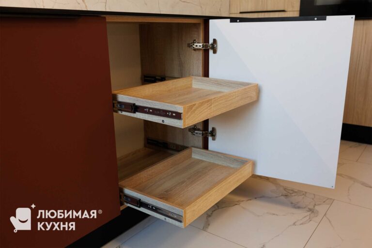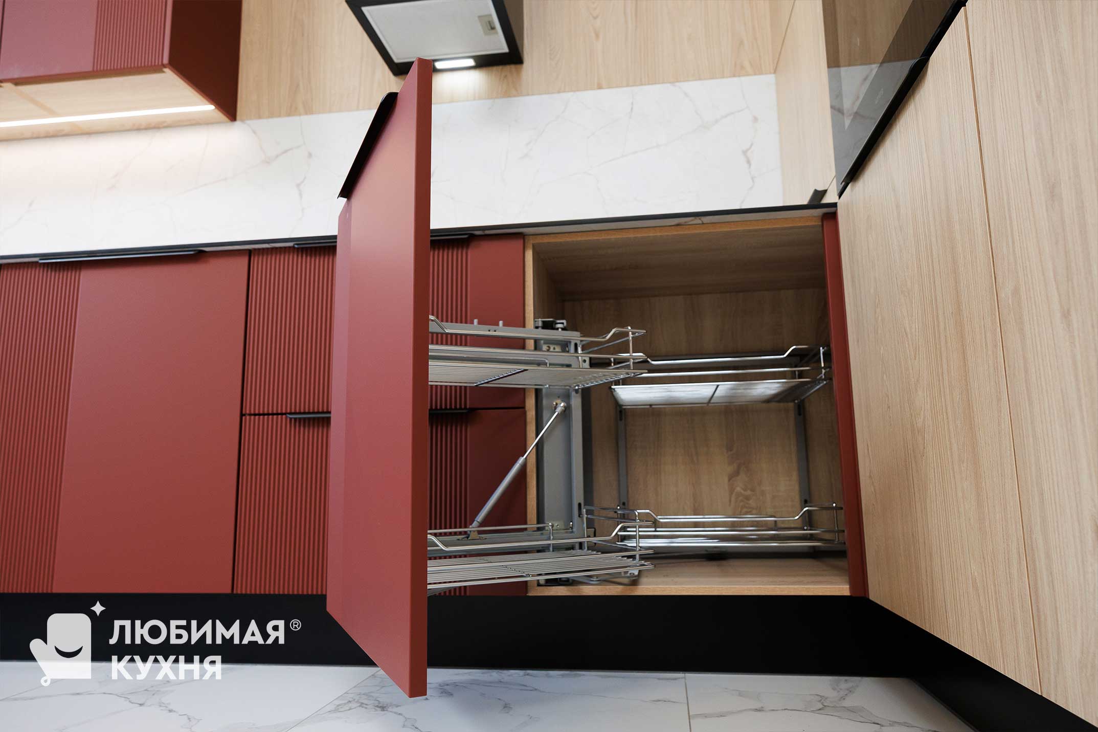 Современная кухня с контрастным сочетанием оттенка бордо и светлых деревянных фасадов. Главный акцент — высокий пенал с открытыми полками в чёрном металлическом каркасе, создающий эффект лёгкости. Фартук и столешница из белого мрамора с серыми прожилками гармонично связывают композицию. Чёрные ручки-профили, смеситель и бытовая техника подчёркивают графичность линий. Трековое освещение и минималистичный дизайн делают интерьер функциональным и стильным.