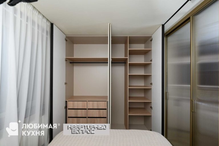 Угловой шкаф с распашной дверцей и дверцами на механизме Hettich Wing Line с Push to Open механизмом открытия с нажатия на фасад.