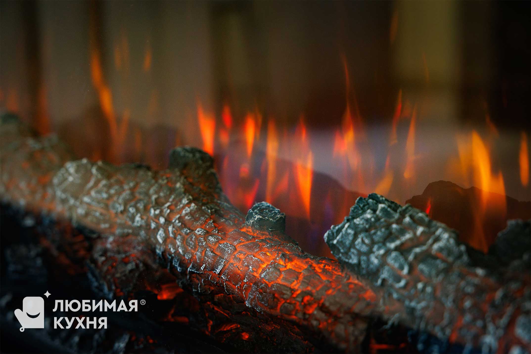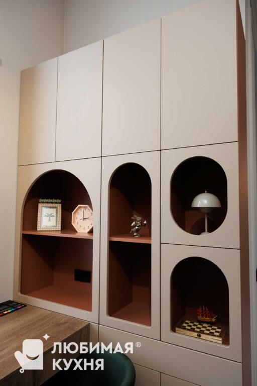 Гостиную в современном стиле с контрастным сочетанием графитового и бежевого оттенков. Фасады шкафов украшены геометрической фрезеровкой и длинными золотистыми ручками. Открытые полки с текстурой мрамора и тёплой подсветкой создают эффектную экспозицию для декора и книг. Встроенный электрокамин с эффектом живого пламени добавляет уюта, а рифленые фасады нижних тумб с подсветкой усиливают ощущение лёгкости. Идеальное решение для хранения и создания атмосферы в современном интерьере.